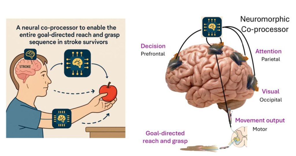 The figure demonstrates the primary objective of the project which is to develop a neural co-processor to restore goal-directed reach and grasp abilities of MCA stroke patients (Source: Generated with ChatGPT).